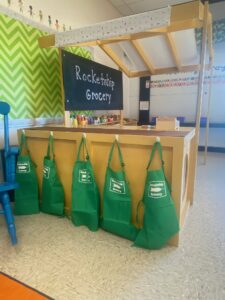 Yeah. So it is a pretty generic, just like mini house structure that I am able to easily redo for different themes throughout the year for the different units that we’re learning about, and then the students are able to have different dramatic play areas that they can play, so we started the year with seasons and fall unit, and so we did a pie-making station, where they got to learn those different vocabulary words and things like that, and since then, we have had a Teddy Bear Hospital, a post office, a grocery store, and next will be a vet.